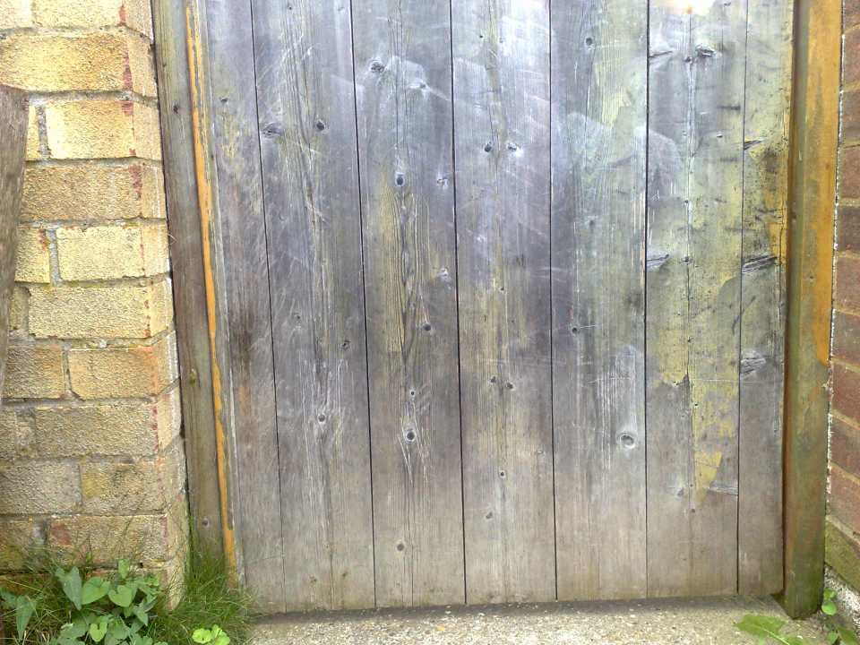 Very weathered gate with deep dog scratches